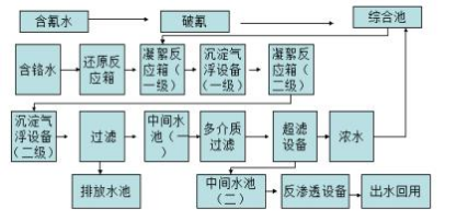 采用物理化學(xué)方法對(duì)電鍍廢水中的重金屬進(jìn)行分離處理,通過兩次調(diào)節(jié)廢 水的 pH 值,使廢水中堿性重金屬離子和中性重金屬離子分別在其最佳的沉淀 環(huán)境內(nèi)進(jìn)行沉淀分離, 達(dá)到去除重金屬的目的,使廢水達(dá)到《電鍍污染物排放 標(biāo)準(zhǔn)》(GB21900-2008)中的標(biāo)準(zhǔn),再對(duì)達(dá)標(biāo)的廢水進(jìn)行雙膜法(超濾膜+反 滲透膜)分離,進(jìn)一步去除水中的各類金屬離子,反滲透膜清水側(cè)出水達(dá)到電 鍍清洗工藝用水水質(zhì)標(biāo)準(zhǔn),回用于電鍍生產(chǎn)線,反滲透濃水側(cè)出水再經(jīng)過一次 物化沉淀,最終使?jié)馑_(dá)標(biāo)排放。