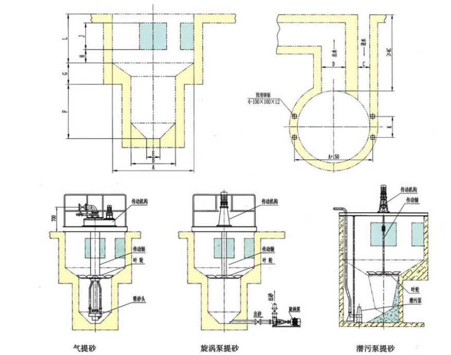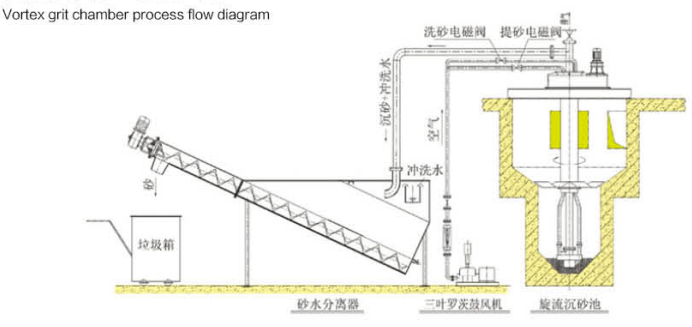 工作原理及構(gòu)造:進(jìn)水從切線方向進(jìn)入池中,形成旋流,軸向流攪拌機(jī)控制水流的流速與流態(tài),水流夾帶大 量粘附有機(jī)物的砂,在槳板攪拌剪切下相互剝離,砂依靠砂的自身重力和旋流作用向中 心砂斗下沉,剝離的有機(jī)物隨軸向水流向上溢走。砂斗積聚的砂經(jīng)空氣提升泵或砂泵提 升,砂與少量污水進(jìn)入池外砂水分離器內(nèi),砂分離外排,污水回流至格柵井。