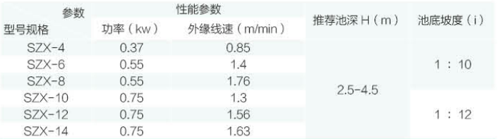 工作原理:SZX 型中心傳動濃縮機采用蝸輪蝸桿(<φ8m 可采用擺線針輪減速機,>φ14m 采用中心回轉(zhuǎn)齒輪)傳動,刮泥壁上設(shè)計有縱向攪拌柵條,刮臂旋轉(zhuǎn)時柵條起攪拌作用,加速活性污泥的下沉,刮泥板外緣線速度≤3m/min。整個刮泥機構(gòu)可以手動提升400mm (用擺線針輪減速機不可以提升)。