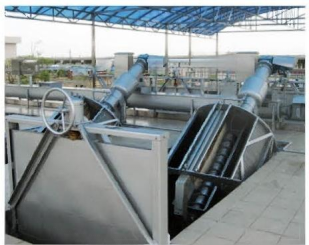 工作原理:轉鼓式格柵除污機與水平面呈35°安裝在水渠中,污水從鼓的端頭流入鼓中,水通過柵網的柵縫流出,固體垃圾被過濾在柵網筐內,帶有耙齒的清潔臂在圓周運動時清理格柵縫隙,耙齒伸入柵網中,將固體取出,當清潔臂處于最高點時,通過水的沖洗及擋渣板的作用,將垃圾從耙齒上清除下來,并掉入垃圾收集裝置螺旋輸送斗中,在輸送過程中通過變螺距的作用被脫水,在最上端壓縮區被擠干,而擠壓水被回流至水渠,垃圾最后送入集裝箱或后繼設備,再進行處理。