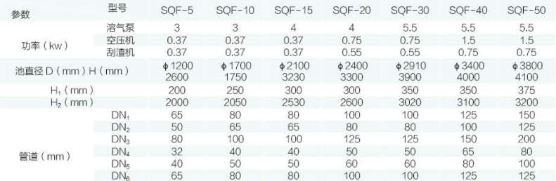 工作原理:溶氣水從池底部進入,污水從上部通入池內的分離罩中,兩者完 全混合,溶氣水經釋放器形成大量的微小氣泡,在氣泡的粘附裹 攜下,與懸浮物形成比重小于水中團體,迅速浮出水面,形成浮 渣,經撇渣裝置刮除后,流入渣槽中,排出池外。