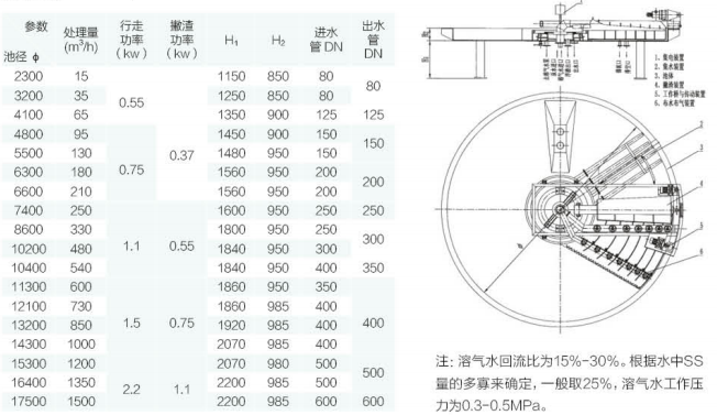 4、采用溶氣水與原水完全分開布水的方式,配專用釋放器。處 理效果好,SS 去除率高達90%以上,出渣含固率可達3-4%。 5、自動化程度高,管理方便,運行可靠。