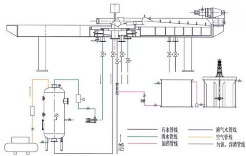 工作原理及構造:利用溶氣系統向水中溶入大量的空氣,形成溶氣水,進入待處理水中,減壓釋放后在水中形成大量的微細氣泡,氣泡與水中 的雜質、絮粒相互粘附,形成比重小于水的浮體,從而快速浮出水面,經刮渣裝置撇除后,完成固、液兩相分離,使水質得到 凈化。主要由池底、撇渣裝置、工作橋與行走裝置、布水布氣裝置、集水裝置、集電裝置組成。